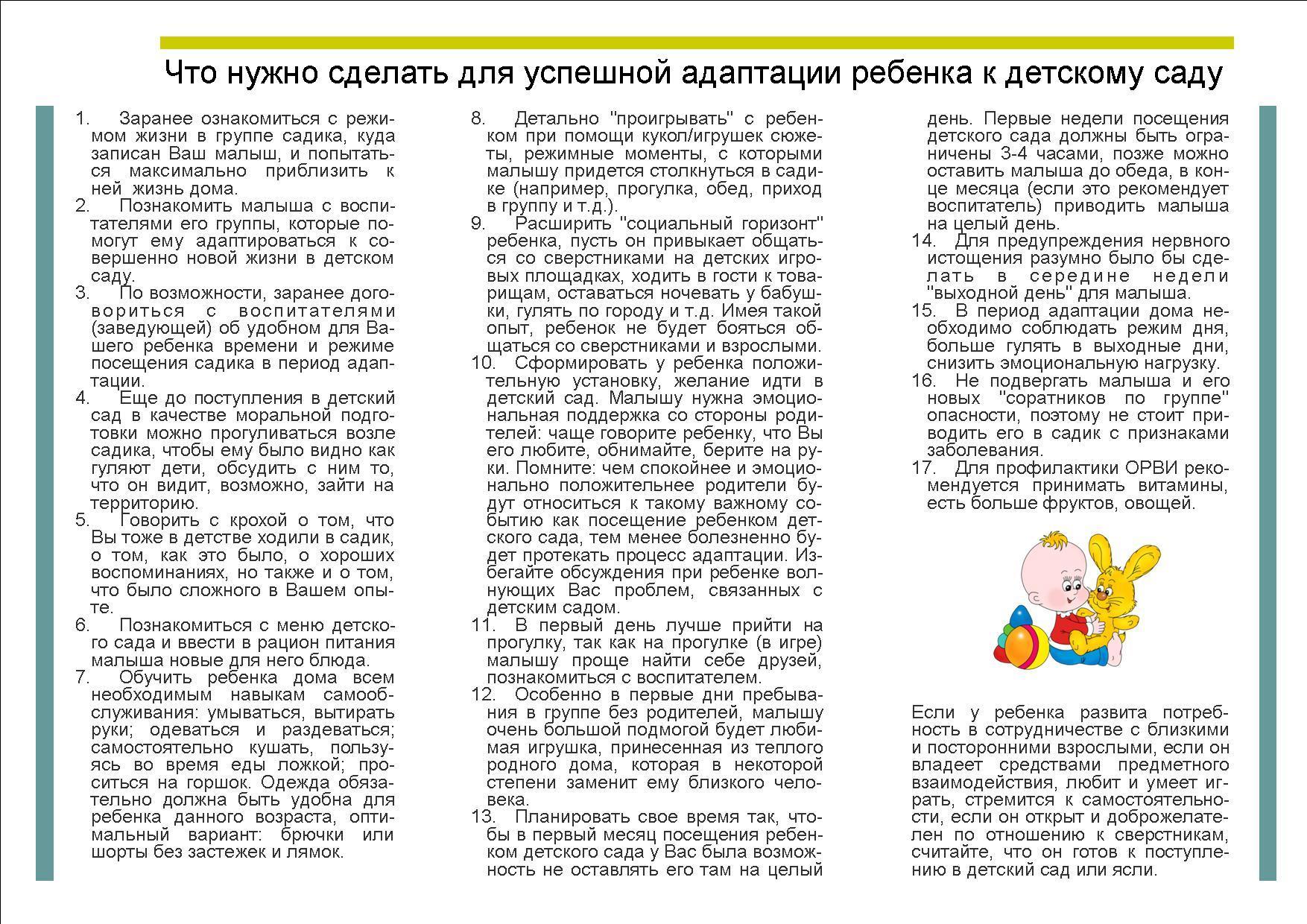 9. В первые несколько дней ребенок чувствует себя в детском саду скованно. Постоянное сдерживание эмоций может привести к нервному срыву, поэтому в период адаптации ребенку просто необходимо «выпускать» эмоции в привычной домашней обстановке, не вызывающей скованности. Не ругайте его за то, что он слишком громко кричит или быстро бегает — это ему необходимо.